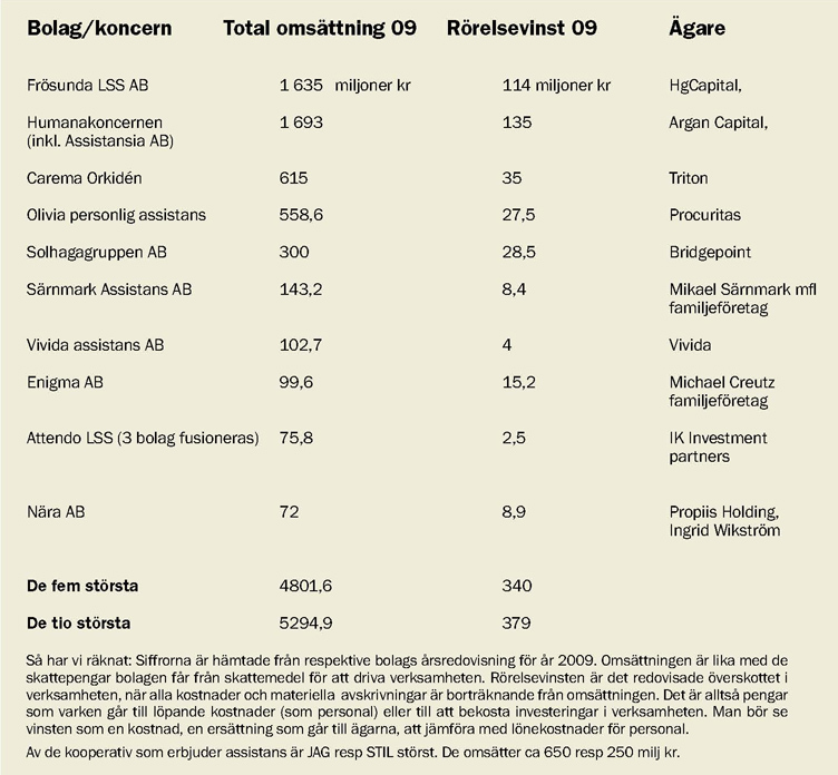 Det tycks också vara lönsamt att driva gruppbostäder, daglig verksamhet och sälja personlig assistans. Vinstmarginalen bland de största koncernerna och företagen ligger här på mellan 6 och 10 procent. För Frösunda landade rörelsevinsten på 114 miljoner 2009. Humana (där Assistansia ingår) gjorde samma år en rörelsevinst på hela 135 miljoner. Orkidéns rörelsevinst slutade på 35 miljoner, Solhagagruppens på 28 miljoner, och Olivias på 27 miljoner.