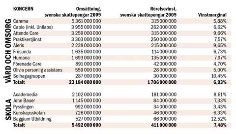 Nu kan vi avslöja hur skattemedel blir till enorma vinster i de privata bolag som driver skattefinansierad vård- och skolverksamhet. Förra året kunde de 15 största räkna hem drygt två miljarder kronor, en vinstökning med nästan 30 procent jämfört med 2008. Med hela denna sektor inräknad hamnar vinsten på minst tre miljarder kronor. Och ofta är de riskkapitalbolag som står som ägare skrivna i skatteparadis – Triton har valt Jersey och EQT Guernsey – med obefintlig insyn.