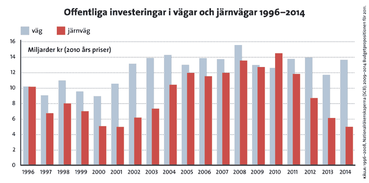 Hur fördelningen sett ut beror lite på hur man räknar. SCB visar att totalt 325 miljarder har plöjts ner i ny infrastruktur de senaste 15 åren. 56 procent av detta har gått till vägbyggen, resten till järnväg. Om man istället jämför Vägverkets och Banverkets kostnader för nyinvesteringar, och lägger till Botniabanan, landar man på totalt 255 miljarder. Av det har 55 procent gått till vägar. Hur man än räknar har mest pengar gått till vägbyggen.