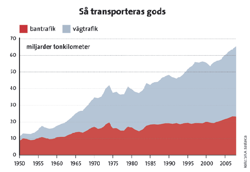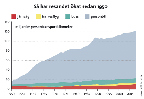 På 1950-talet exploderade bilismen. På två decennier tiodubblades Sveriges fordonspark, och 1970 stod bilen för tre fjärdedelar av resandet. Samtidigt minskade tågresandet med 30 procent och till slut skedde bara var tjugonde långresa med tåg. Dessutom fraktades allt mer gods med lastbil.